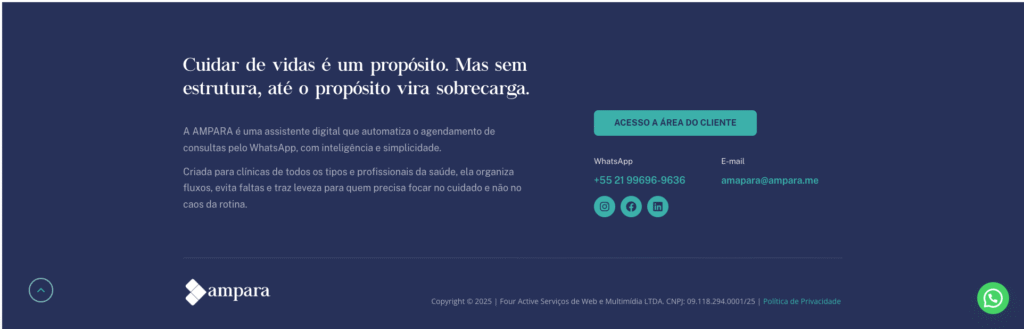 Outra forma de acessar o sistema é através do site principal https://ampara.me, clicando no botão LOGIN no topo da tela ou no botão ACESSO À ÁREA DO CLIENTE no rodapé.